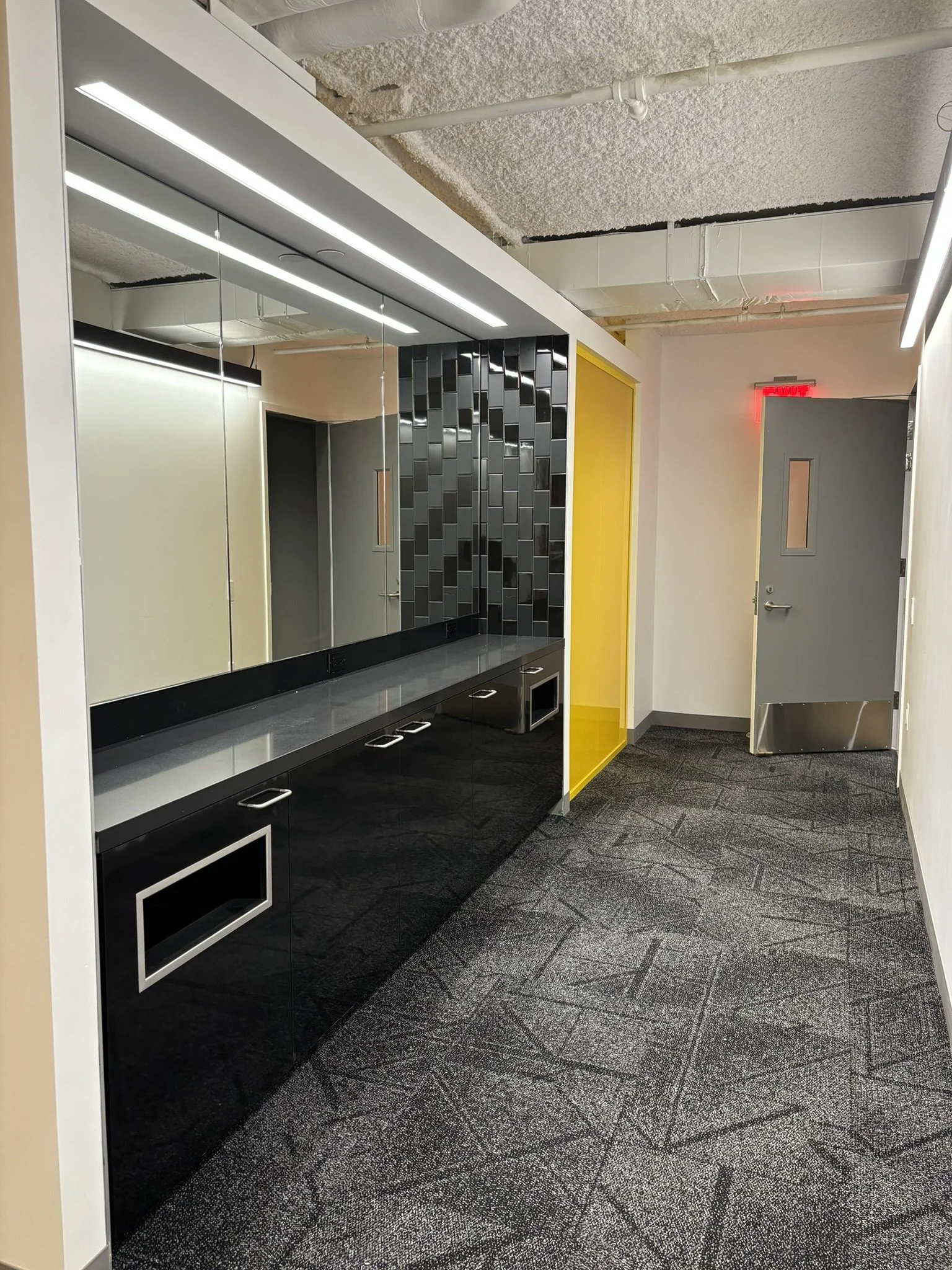 The Pratt ARC locker room renovation included a complete redesign of existing office, locker room, and team support spaces to a welcoming, gender inclusive bathroom and locker room facility, with supporting team spaces, offices, personal trainer and storage spaces. The project was informed by student engagement to understand their ideas and experiences and finished construction in 2024.
